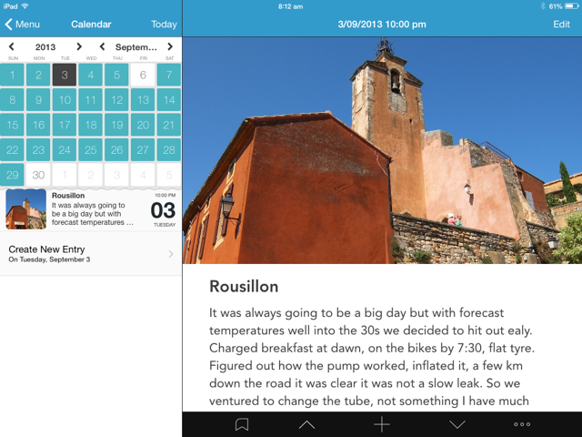 Before we headed off on our 2013 cycling adventure I scanned through the App Store for diary apps. Most were more suited to the Bridget Jones type of diary keeping but I did find one; “Day One”, which I used every day while away and, on many days since my return.