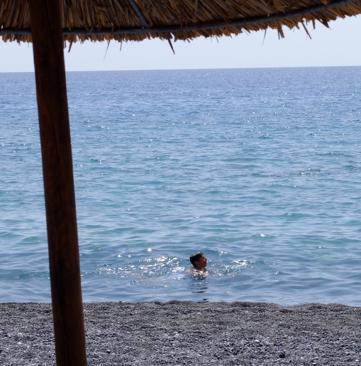 We of course did not wimp out. Ruth was showing signs of dehydration by wanting to go into any taverna that appeared to wait for the boat (they could have been mirages for all we knew). However, I had re-read Joe and Beth Volk’s blog posts on their experience and knew that; a cool dip in the Libyan sea, rest and a cold beer in the shade of a beach umbrella, were the prize of the patient. All of these proved to be true so thank you Beth and Joe. We enjoyed our blat out while we waited for the ferry to Hora Sfakion (boat is the only way out).