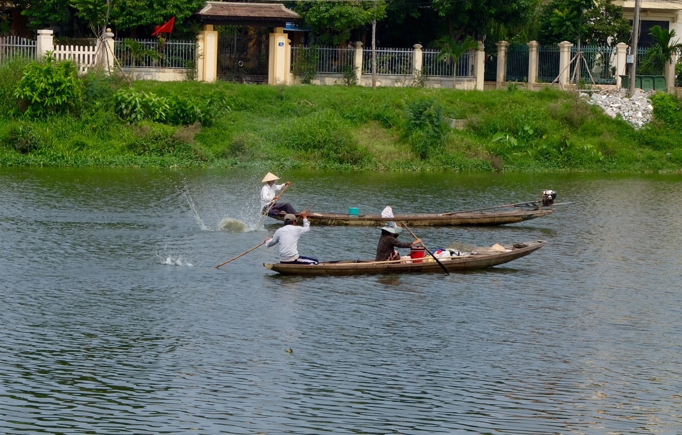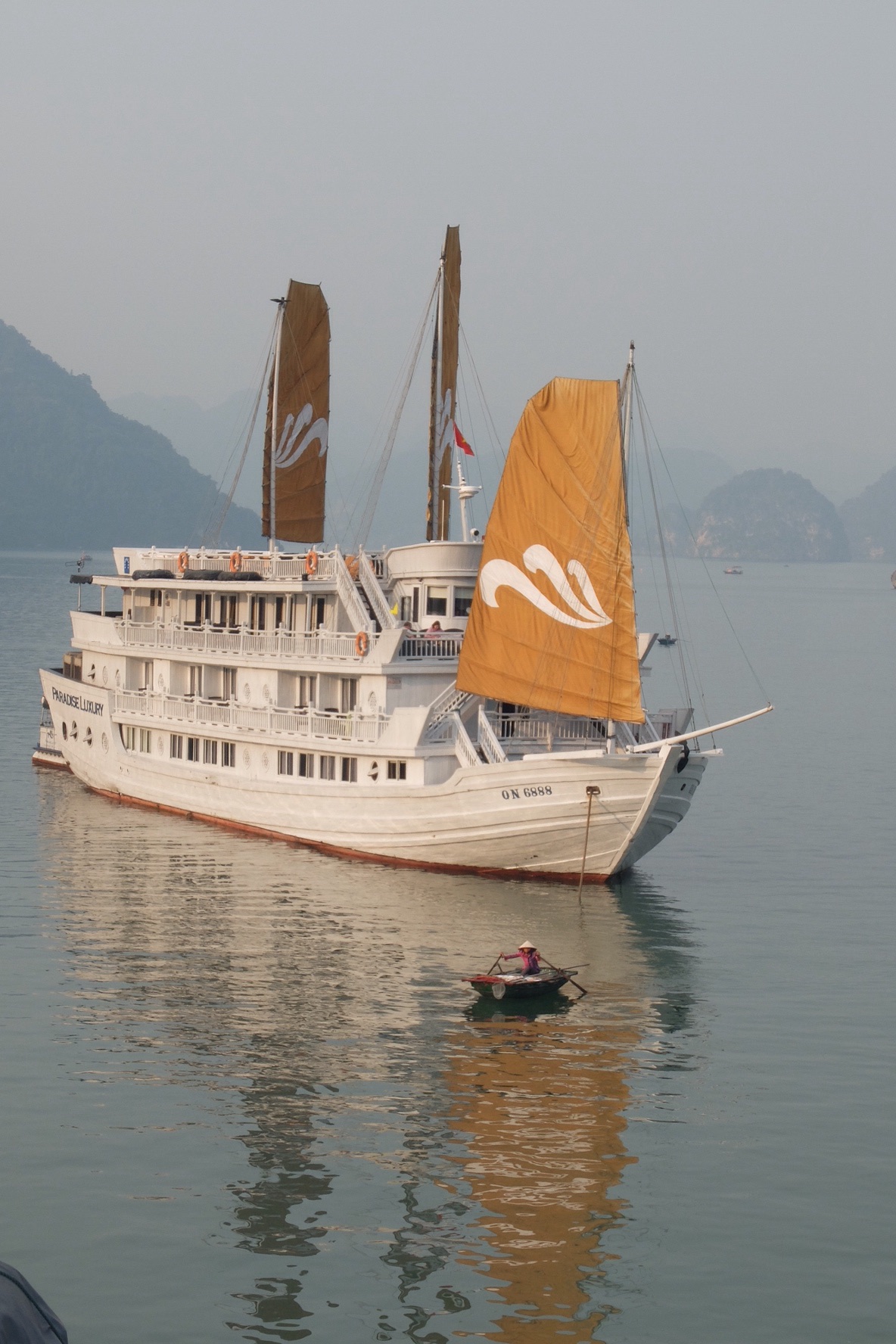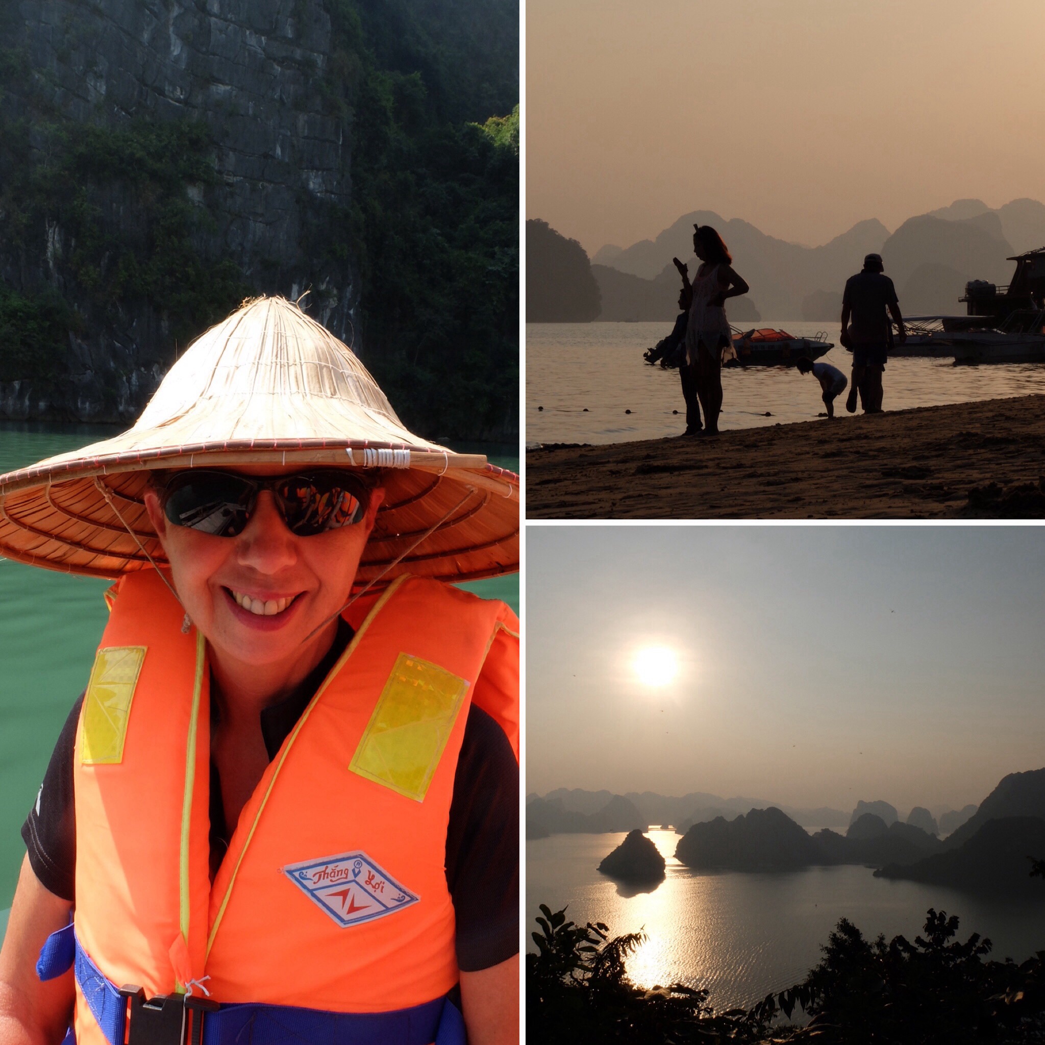 Most of our fellow visitors to Halong Bay only stayed for a night and that is probably all that you need. However we had booked two and, on day two were transferred to a “day boat” along with five other people. It was a pleasant day that took us away from the tourist congestion of the main bay, we visited a floating village, did some kayaking, swam at a tourist free beach and also struggled through a five course lunch which, for non-lunch eaters, was a battle. Ruth waved the white flag after two courses even though the food was excellent.