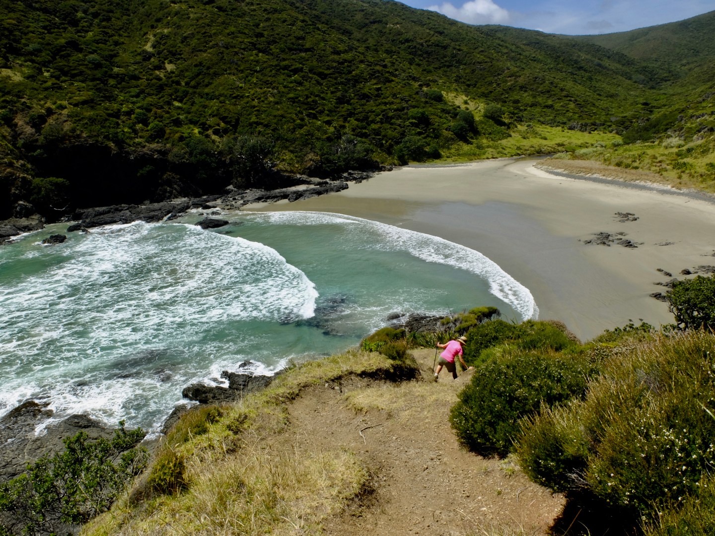 On our walk down to “Sandy Bay” (as bad a North & South), while I had been busy photographing some tiny bees that were weighted down with bright orange flax pollen, Ruth had wandered on ahead. As I rounded the corner she gave me the “we have a situation” signal. “Get ready to run back up the hill”!. I thought that dehydration was setting in, Ruth was never going to suggest walking up a hill let a lone run up it. Then she pointed to two cute little piglets on the path in front of her. We both knew that if we got them a little excited, squealing would ensue which, in turn, would result in one much larger and angrier mum charging at us from any direction out of the bush. We waited patiently, the pigs sensed that we were blocking the path and eventually wandered off, we found a new spurt of energy and hurried off on our way.