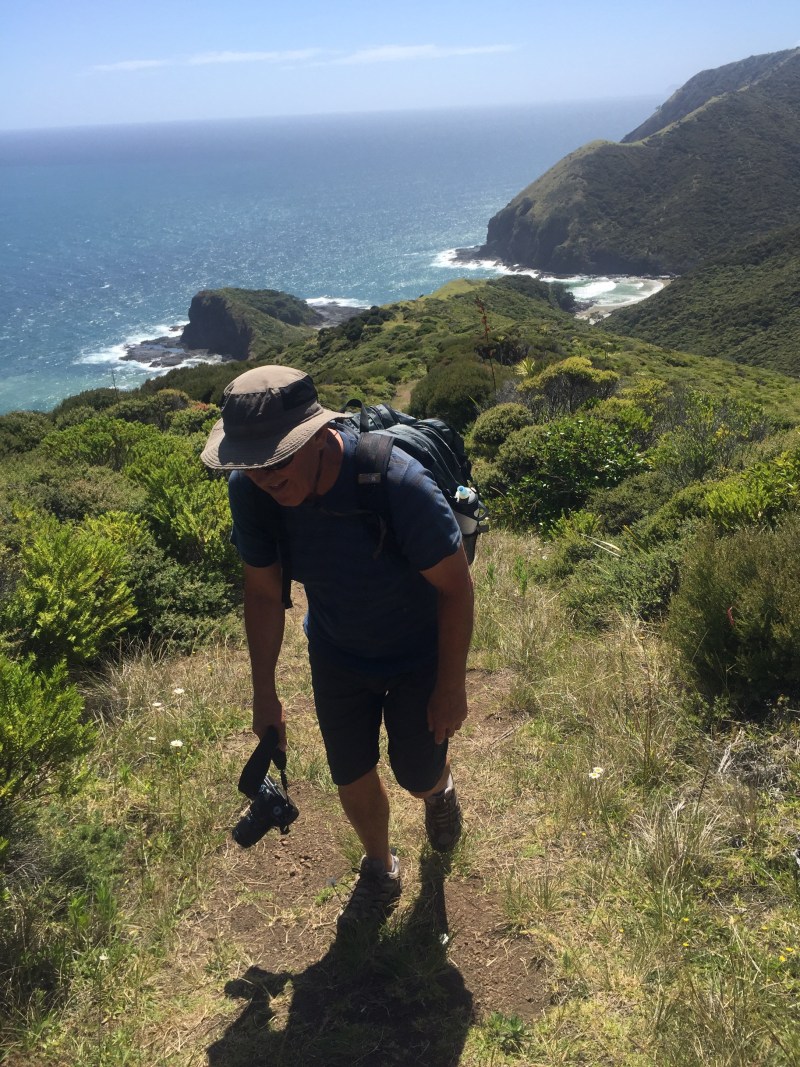 The climb out of the Bay the next morning was far worse than it looked from sea level. When we finally clawed our way to the top, the track leveled off as I had predicted. After about a kilometer of flat walking Ruth halted, pointed ahead and pleaded “we don’t have to descend down to that beach do we?”. I wiped the curtain of moisture from my eyes and the first thing I noticed as I scanned the scene was what was clearly a walking track rising from the beach up towards the Cape. But the beach was almost vertically below us. I knew the track would go down very steeply and it was not the descent that I was was worried about but the walk back up it later in the day.