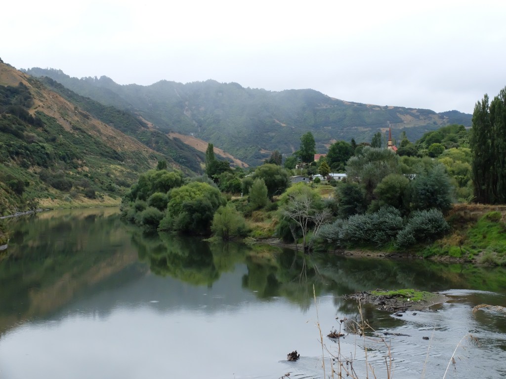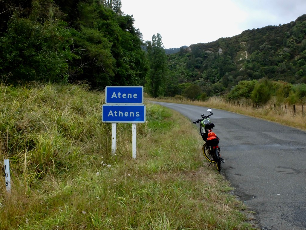 What a ride. Starting in Whanganui National Park, the narrow but sealed road winds in way along the left bank of the Whanganui river. I have read that it is “the Rhine of New Zealand”. Whoever gave it that description must had had more than a few bottles of Rhine Riesling before reaching that conclusion. With no tourists, no traffic, no people, nothing but bush, a few wayward farm animals and a sense that you are out the back of beyond. The only similarity with the Rhine was the water flowing towards the sea. I suspect that the same character had been responsible for naming the ‘settlements’ along the way. First I rode through Jerusalem, then London and a little later, in dense bush, Athens.
