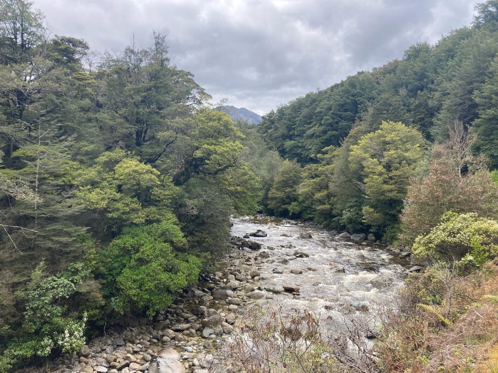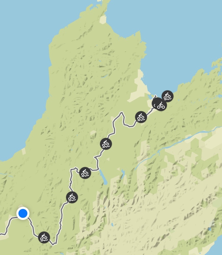 On Saturday I rode the Braeburn Track from Lake Rotoroa, in Nelson Lakes National Park. It was another track with stream crossings through very ruggered beech country. I could not get my navigation app to fire up as there was no wifi or cell reception and I was relying on my memory of the elevation profile. I recalled that it was a short climb and then a long downhill to Murchison. Problem was; I didn’t think too much about our starting altitude (420m) and while another 260m is not much, by the time I hit the summit it was freezing. What I have discovered is that while you are grinding away up these hills the body is kept warm by your efforts and the lack of wind chill. When you effortlessly race down the other side, the wind chill kicks in as the effort kicks out. I got it right for todays descent from Rahu Saddle, I had my warm gear for the 40km downhill.