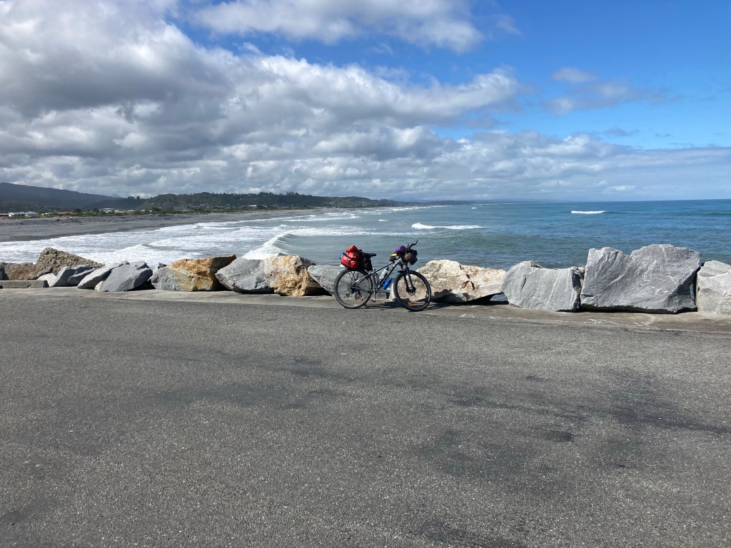 I entertained the road construction crew by unpacking all my gear to retrieve the tape and scissors. I still had 30km to ride to Greymouth so it needed to be a reasonably sturdy ‘weld’. I surprised myself, it held well and I was able to get a replacement rack in Greymouth. The owner dropped what he was doing and I was back on the road for the last few km in no time. It has been the second act of kindness shown to me on that particular section of the ride.