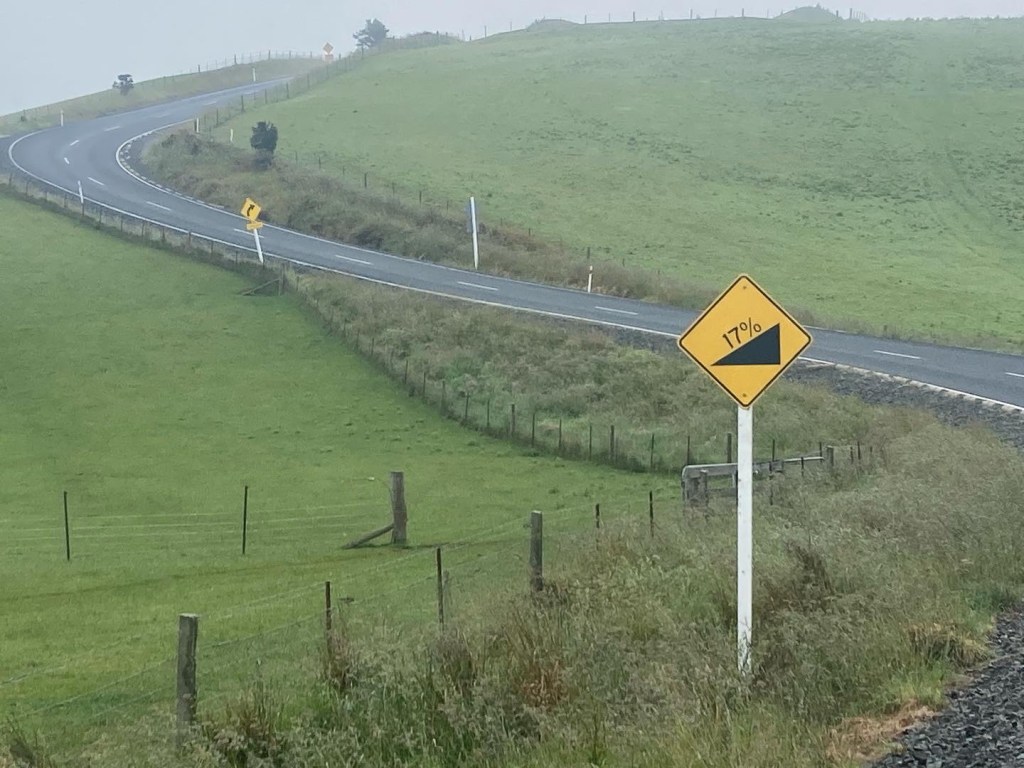 From Lawrence good ol Komoot had planned a nice quiet route to Balclutha. Gravel road with just silly sheep and inquisitive cattle for company. One obstacle, a 390m hill. It dawned misty and cold so I layered up. Within minutes I was started to climb the steepest slopes of the entire ride. The gravel gave way to seal on a particularly vertical section then back to gravel – despite being concerned that I should have packed chains for my tyres, the three layers and the effort had me feeling as though I was in a sauna. Then I spotted a deserted two lane sealed road but as I rounded the corner it was the road that I was on – then all was explained – it was another killer gradient – 17% – I dismounted and pushed the bike. The seal appeared to be there to give the stock trucks traction on these steep slopes. I decided that the unexpected appearance of seal was not a good omen.