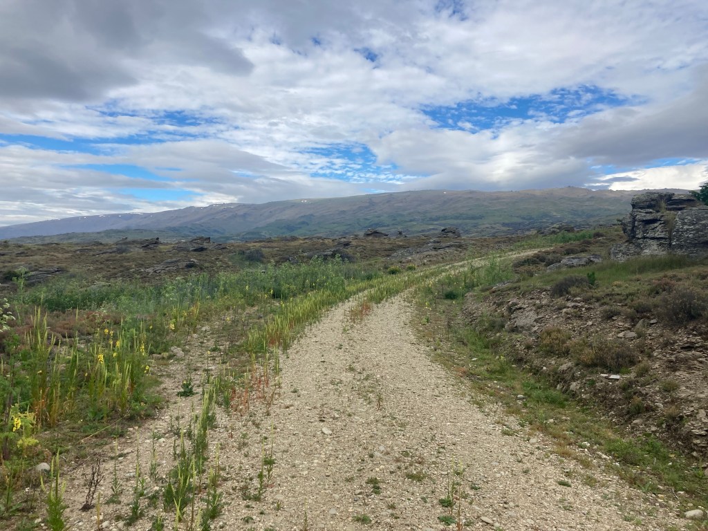 As I headed into the hills from Alexandra the signs were definitely displaying ‘no exit’. Well that probably only meant cars. After an hour of slogging my way up the mountain the next road was sign posted but with a gate – it was open – but indicated ‘private right of way’. With no ‘keep out’ signs and no signs of human habitation I pushed on, the road got dodgier (I was really riding cross country by now) but I could see a real road in the distance giving me encouragement that Komoot was right. Finally I arrived at a locked gate. I knew that getting over it got me onto what was clearly a public road. Off came the heaviest bag and then a bit of weight lifting as I hefted the bike over the gate. I avoided getting shot and pedalled off down the road.