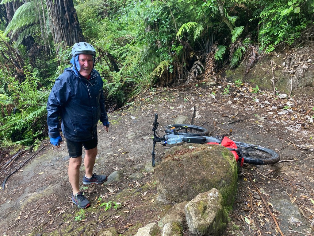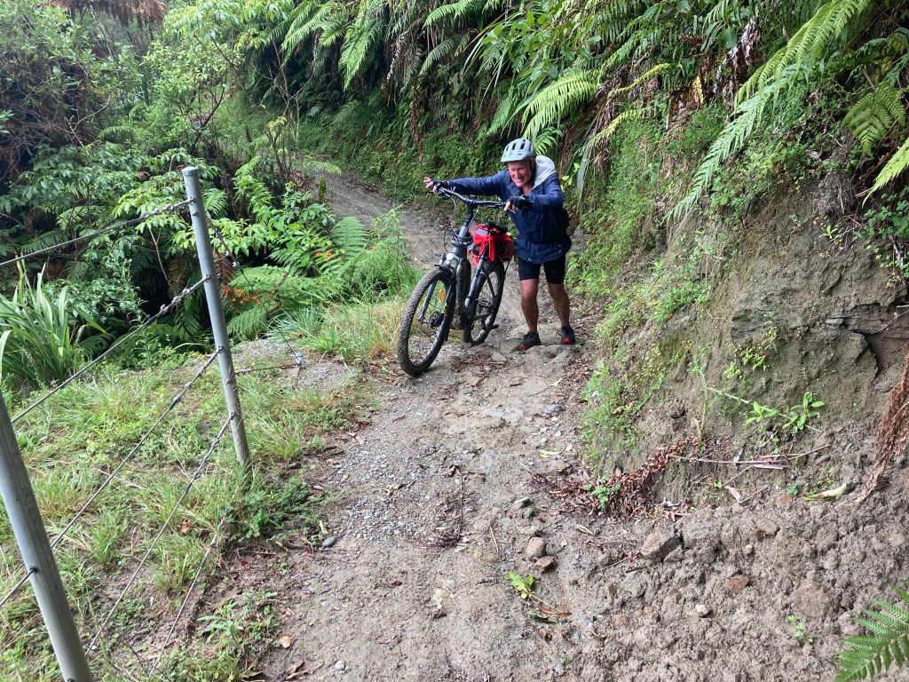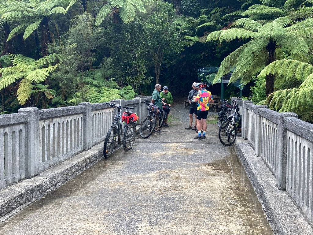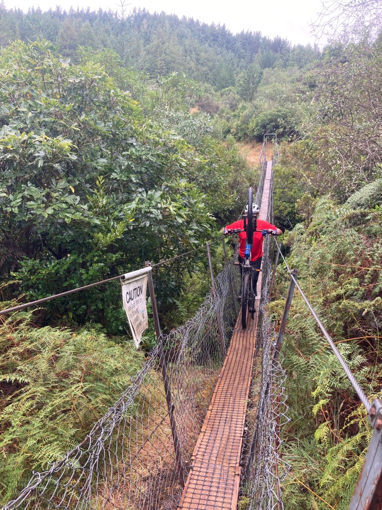 We started with a soggy pedal around the lake then a pleasant ride along deserted country roads until the tarmac gave way to gravel and then a very rough four wheel drive track that lead down to the dreaded dodgy swing bridge that I have heard so many terror stories about. We decided to unpack our gear and carry it across. Walking across this ‘bridge’ with both hands full of gear was not a confidence booster. To get the bike across you flip it up so the the handle bars are above the guide rails and then push it across on one wheel. This was not possible with a much heavier e-bike. We had talked about getting it across with one person on the front and one one the back. The signage on the bridge read “1 person only on bridge”. Looking at the stream a long way below, we decided that a fall was probably not survivable so Howard invented ‘the toggle’ method. This involved him pushing the bike from the rear and toggling the handle bars to get the past each guide wire support and toggling again to get the pedals out of the hurricane wire – it worked and would be perfected later on the Maungapurua track in Whanganui National Park.