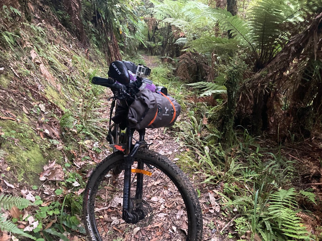 Our head torches and bike light provided a surprising amount of illumination as we bumped along the rough farm track to the start of the Kaiwhakauka track. Thankfully it was light by the time we hit the track as this track was the track from hell, not helped by light rain and punishing humidity. Narrow, and alternating between mud and rock surfaces with a steep drop off into the stream below. It was draining and all five riders had falls, including me when the bank gave way under my foot when I stopped. I found myself in the tree ferns that had fortunately prevented me from falling further. No damage to rider or bike.