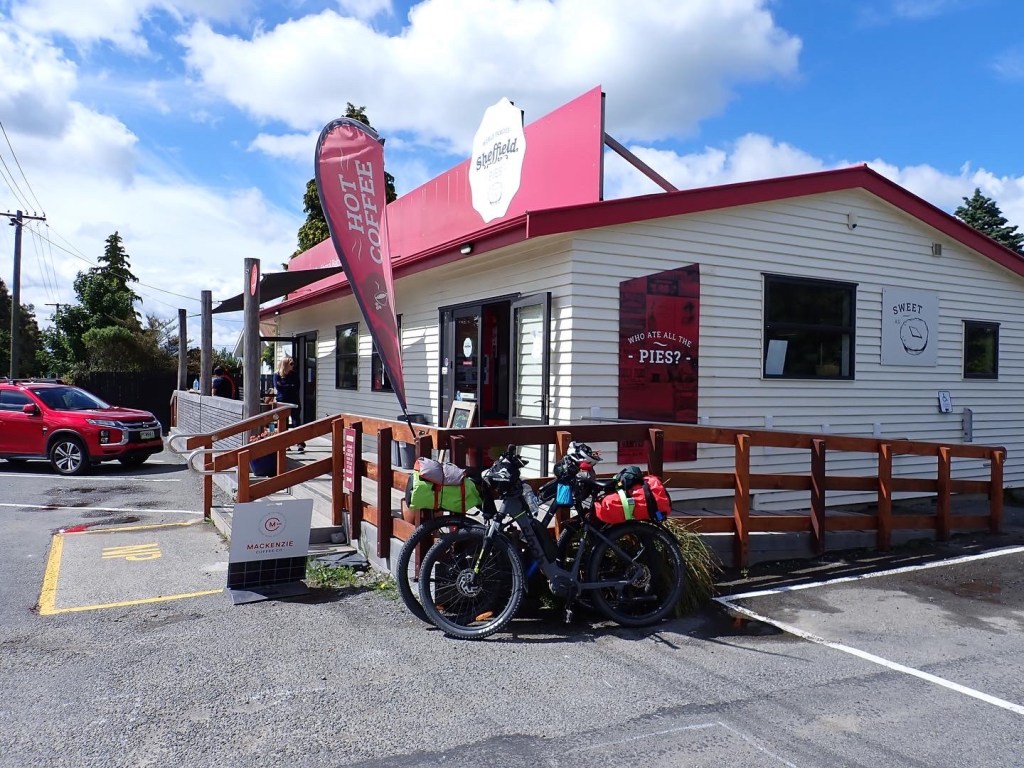 The only slight hiccup on the first section was Howard hitting a pothole while barrelling down a hill. Big red, his carrier bag, took flight, passing him and beating him to the bottom. After suitable adjustments to his luggage arrangements we raced on downhill to Culverden where we found our first and most excellent cafe of the ride and celebrated by having two morning teas.