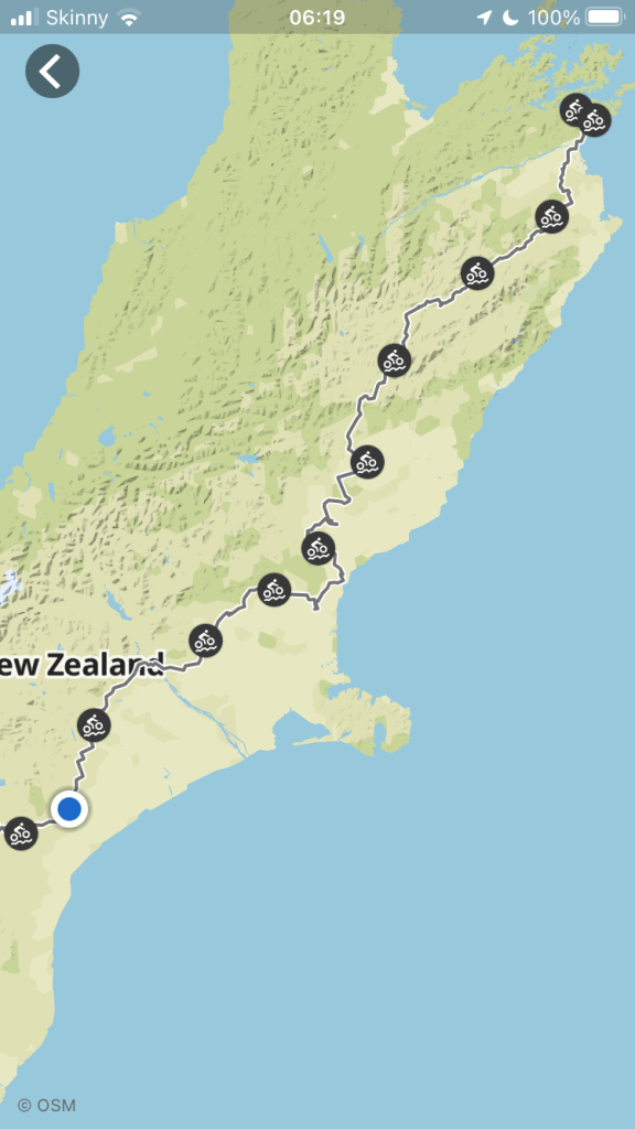 Suitably rested, we headed off for what we expected to be a repeat of the previous day’s ‘easy peasy’ ride. However, the gravel roads returned, similar to the muck we had to deal with on day one. Very dusty and we struck a few trucks on the narrow roads so got a good coating of the local top soil on us. We finally arrived at Amberley and enjoyed good food although keeping it on the plate in the blustery norwester was a challenge. The route out of Amberley required a lot of faith as we headed down a ‘no exit’ road then followed a local bike path onto a river bed and followed that until we spotted a road leading away from the other bank. We crossed the river, and then biked into the building gale.