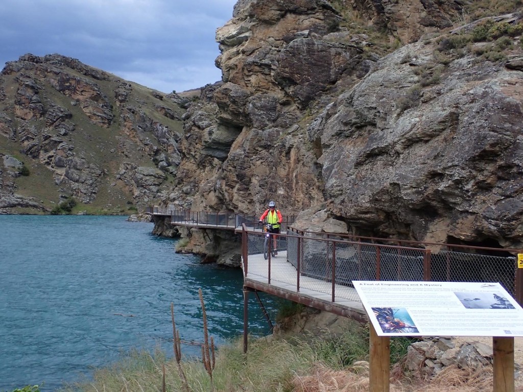 After sampling the Local cafe at Naseby we connected with the Otago Rail Trail through to Omakau for what was a reasonably leisurely but long ride. The next morning we continued on the trail through to Alexandra where we entertained local shoppers as we unpacked our bags and attempted to jam two days food supplies into them. That extra weight probably saved our lives as we hit the Dunstan trail at the same time that a gale force head wind developed. The Cromwell gorge was the perfect geological formation for exacerbating wind strengths and on the precipitous track it was challenging to keep control of the bike. When we reached the suspension bridge it was swaying around in a very concerning way. We decided to walk across with Howard doing a John Cleese silly walk impression as the bridge rolled underneath him.