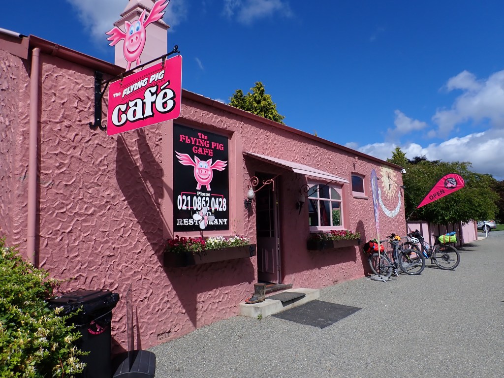 We were viewing the ride to Mossburn as a rest day. However, barely recovered from the punishing ride through the Nevis, we were greeted with a drab, wet and cold day as well as a flat rail trail. The problem with flat is that you have to pedal all the time. At least with hills, you only have to pedal going up them. To make matters worse, our meagre food supplies had been exhausted the previous day and we were running on a minimal breakfast ration of muesli and, with our first potential cafe stop nearly 40km away. Howard was experiencing hot pie mirages and my c-bike battery was flashing on red. Then like a sunburst through the cloud we saw the word CAFE and our bikes turned in perfect formation, not unlike the ‘red arrows’, as we zoomed in on Five Rivers Cafe. I expect that they have retired on their earnings from our visit.