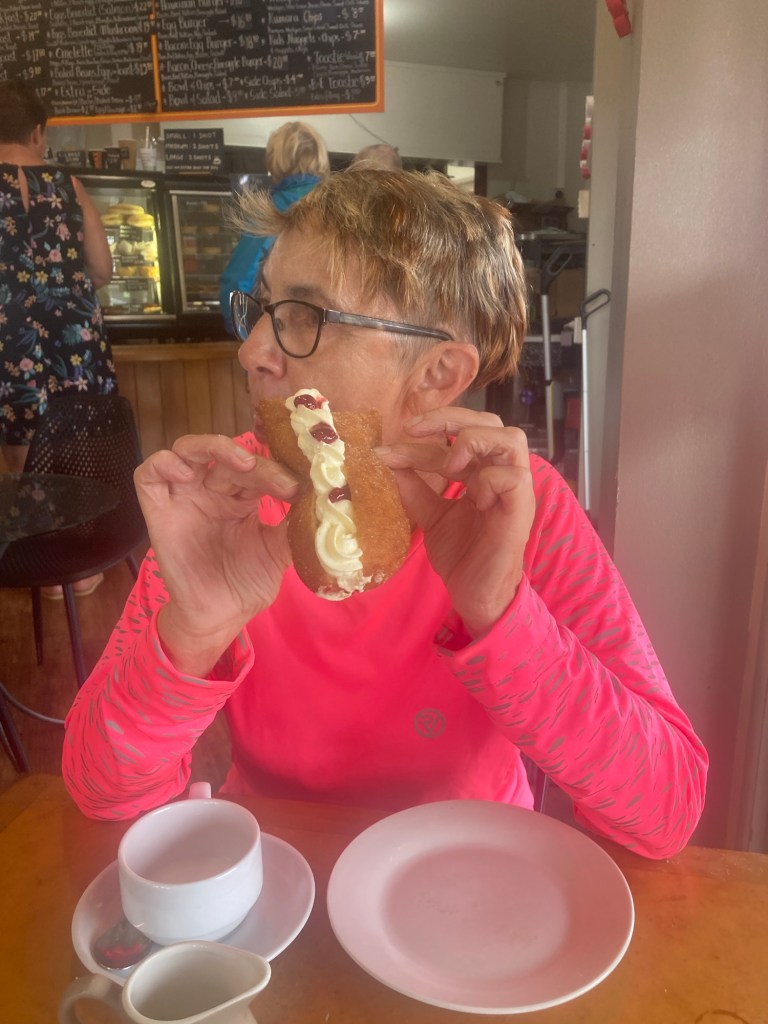 We also came to the first cafe for four days and it was not a very dignified experience. Ruth went for a cream doughnut (Ruth never eats those) and i kept the coffee coming Our stop was well timed as it coincided with the first shower of rain that we have encountered on the ride. By the time we finally dragged ourselves away from the trough, the sun was out but it was not such a threat as we were covered in our long sleeved tops.