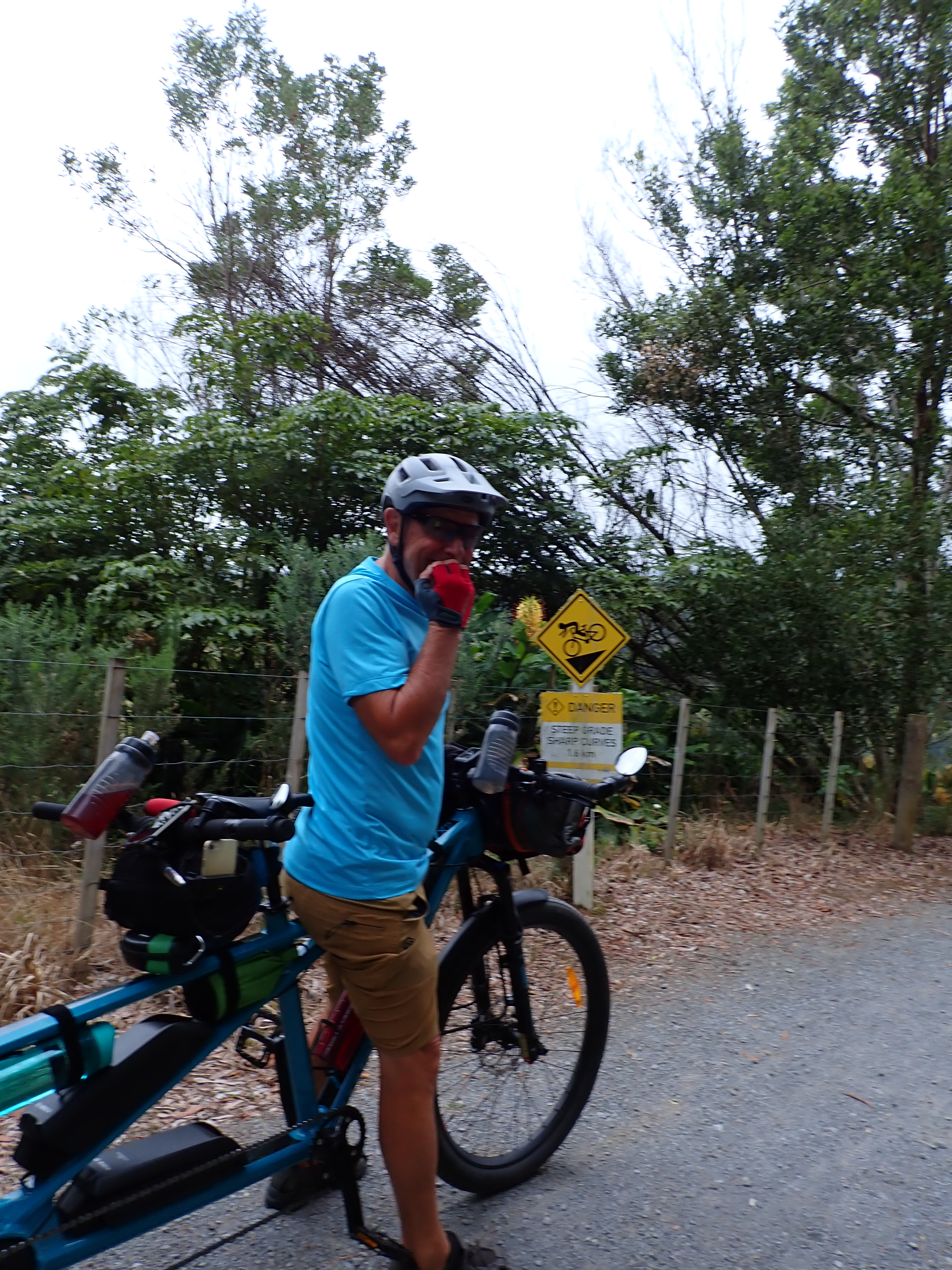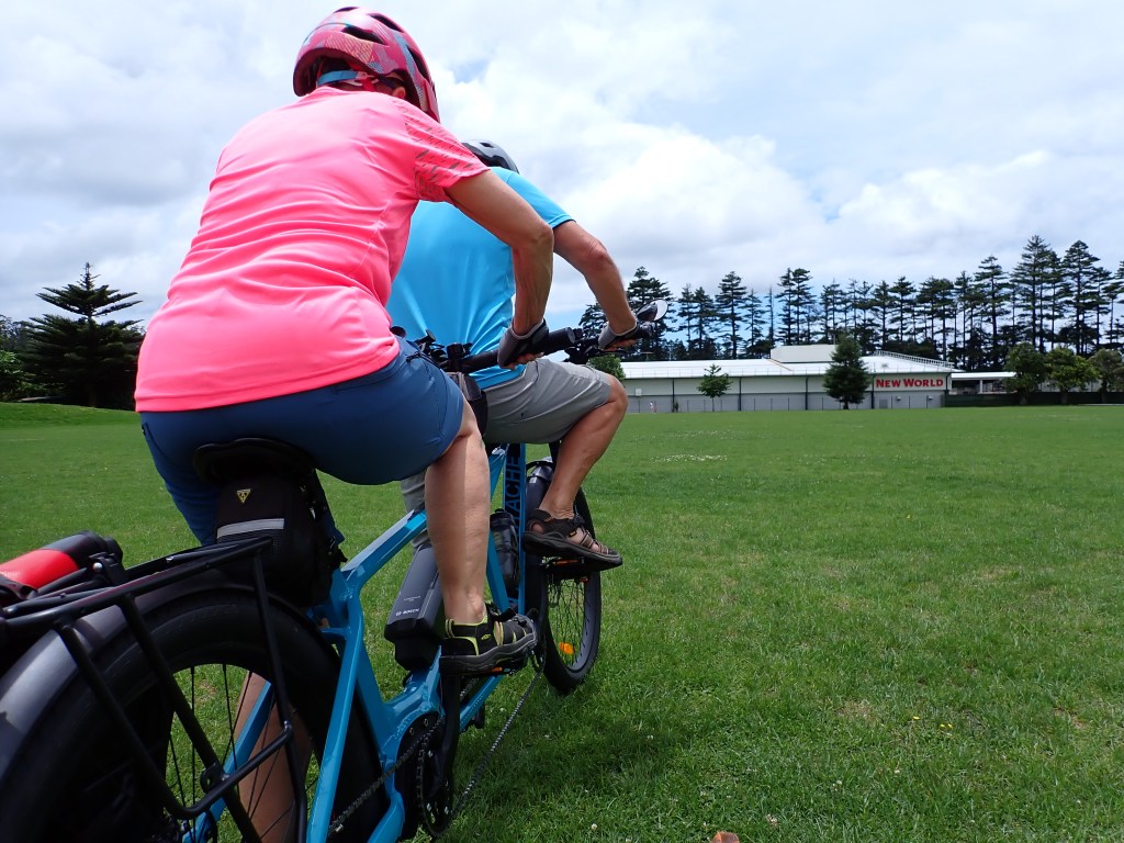 The Mo was carrying a combined weight of around 186 kg and decided to show off its lack of grace when we were hunting for our overnight stay at Whatawhiwhi. The GOTF had a little lapse and mistook himself for a nimble solo rider when the ever-watchful rear admiral (RA) exclaimed, “there it is!” In a moment of unbridled enthusiasm, he attempted a maneuver that might have been feasible on his trusty mountain bike, but alas, a big laden tandem has its limits. Thankfully, our speed was modest, but gravity had its say, and we found ourselves unceremoniously sprawled on the ground in a slomo kind of way. We had already deduced these potential perils on switchbacks back on day 1 and had gracefully sashayed our bike around those treacherous turns. The GOTF has now noted and filed for future reference that even a tight turn on a straight road can be perilous on the big bike.
