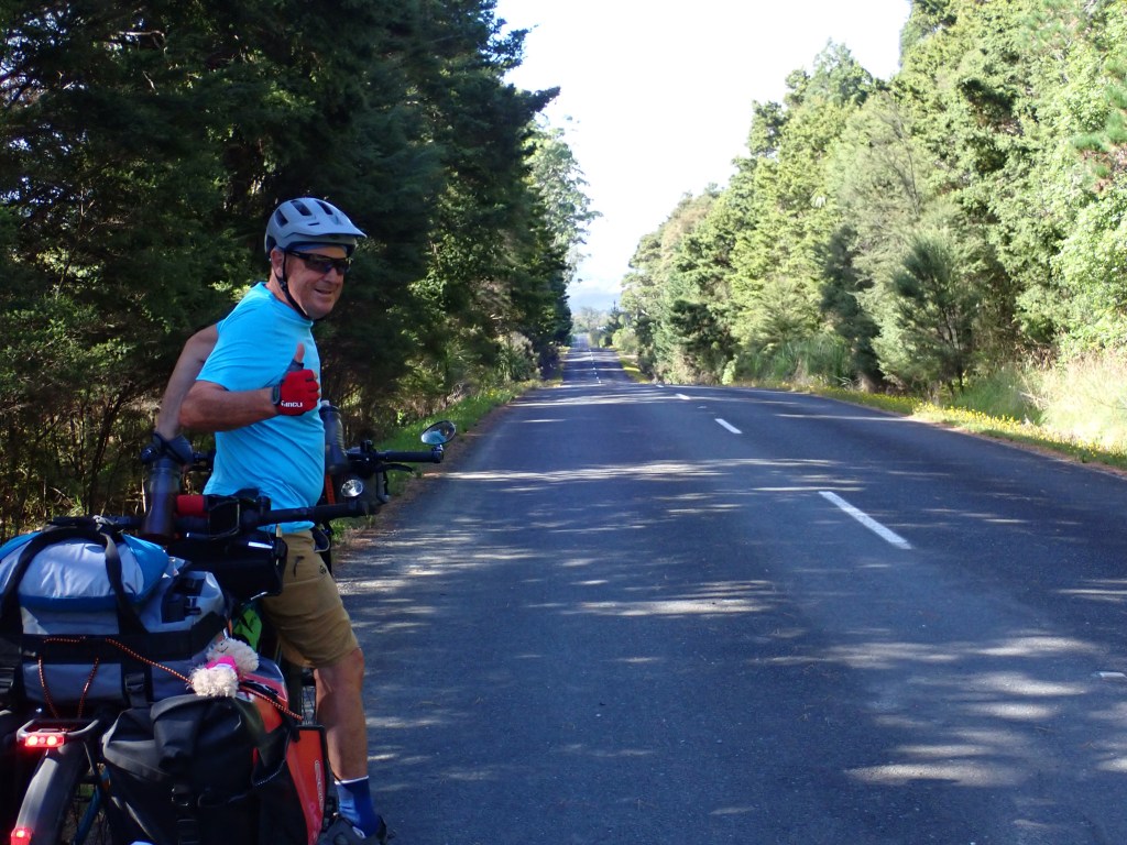 A rare sweet spot – the GOTF celebrates after a nasty 14km of rutted gravel road we hit a sealed section with no traffic – maybe a local elected representative lives along here.