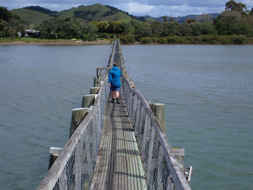 We were planning to take the tandem over the longest footbridge in the southern hemisphere. It is a big deal in Whananaki and was built so that the kids in the settlement on the south side of the estuary could get to school without having to row across it. Anyway, I recalled a couple of issues from a ride on the mountain bike three years ago. It is narrow and there are bars to be negotiated at the south end. We decided to go on a scouting mission before committing the bike to the bridge in the morning. It was worth the effort as our fears were confirmed. This bridge was not going to be negotiated by the longest bike currently residing in Whananaki. If we had somehow managed to get the bike across the bridge the only way we would get it back was very slowly, in reverse. That would not have been a good start to our next day.