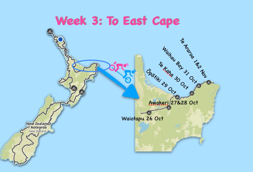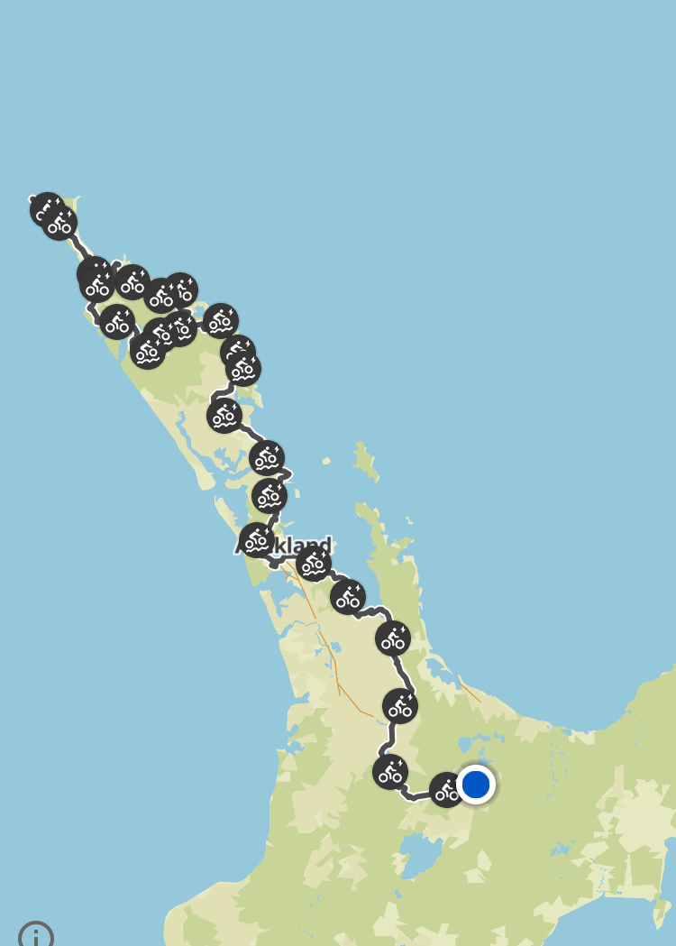 Since our last update we have made it to Waiotapu, a stones throw from Taupo and 1,453km into our 7,500km journey around Aotearoa. We are hanging out for our next scheduled rest day which is 1 ride and 80km away. Our unsettling (of the stomach variety) delay in Whangarei has messed up our breaks and we will have been pedaling for 11 days when we finally limp into Awakeri Springs near Whakatāne.