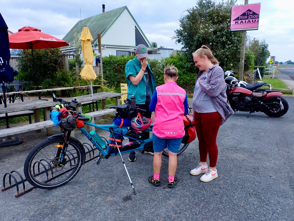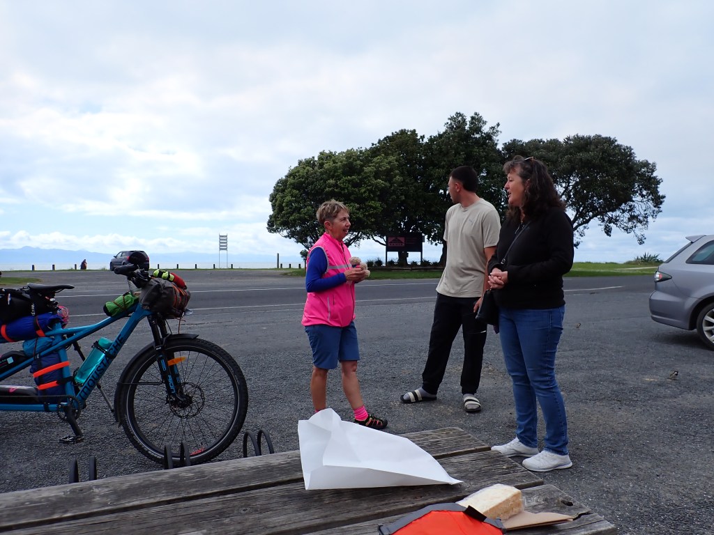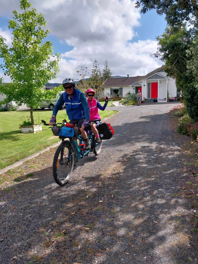 Our airbnb hosts Tony and Bev at Red Door, Kopu, really went out of their way for us. We had experienced a rather unpleasant 22km section of the Hauraki Rail Trail. They were rebuilding the stop banks where the original trail ran and had put a “temporary” narrow replacement in. The person responsible for the job had obviously never ridden a bike on trails or had received the deal of the century from the local quarry. The track had very coarse, uncompacted metal on it which made for a very challenging ride. Then their signage was out of date and we discovered that another section was closed, but only after we had biked to the area they were working on. The RA was ready to unleash some surface to surface missiles at the diggers. Anyway, I digress, the airbnb was very comfy and stocked with quite a few goodies. They cleaned the thick dust off our gear and we put the tandem securely to bed in their garage. Great stuff.