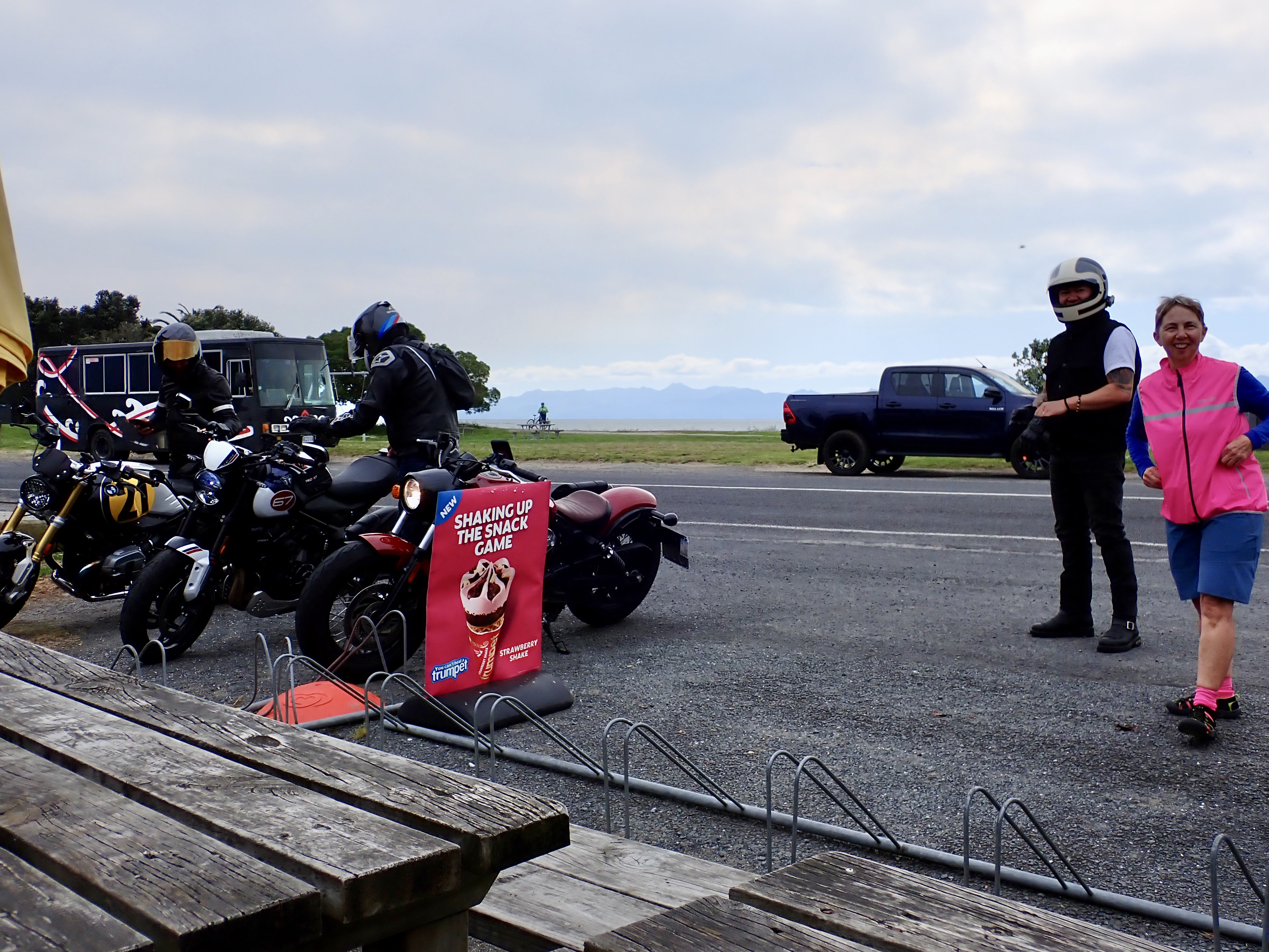 We had experienced a very smoky journey down the Seabird Coast. It was a very pleasant ride and we had planned to have lunch at the Pink Shop in Kaiaua. It was a busy spot and we did not think we were going to get away. Our planned 30 minute stop turned into nearly 2 hours but we met a host of different and interesting people. It was a lot of fun and these stops give us a real buzz.