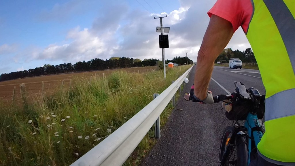 We also experienced another unpleasant brush with cows. This time it was an irrigation arm that was spraying liquid poo onto a paddock. Unfortunately, we were biking along a rare, but dreaded, section of State Highway 1. The road wasn’t too bad as there was a good shoulder but it was busy. I could see the irrigator ahead, situated close to the road and I could also detect from the smell and colour of the spray that it was not water. Well on a busy road you cannot ride wide to avoid the spray so, you take a very deep breath, crank up the power level and gearing, and pedal like crazy. Not the most pleasant experience, brought back memories of Mt Nicholas Station. A good long shower is also a highly recommended tactic.
