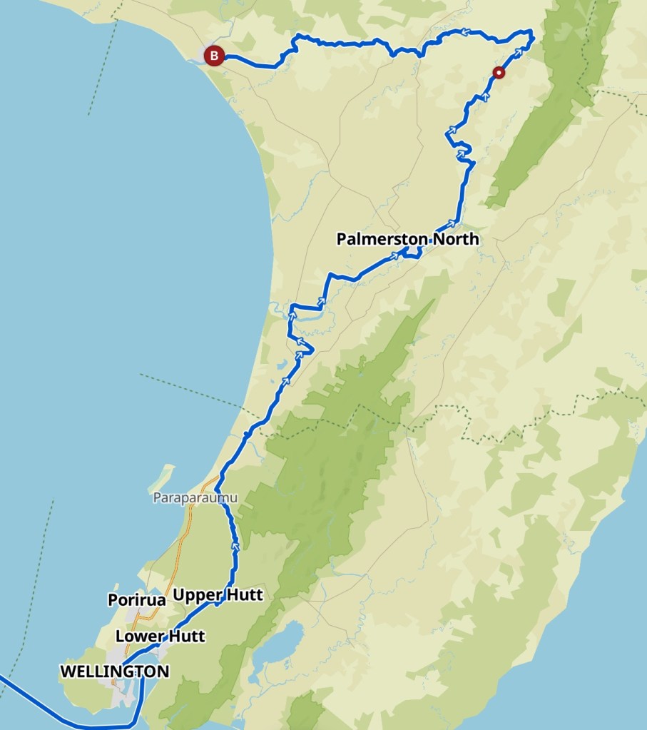 The route that I took through to Palmerston North was not part of the Tour Aotearoa. That route is on the other side of the ranges, we followed that when we rode south. As I didn’t want to cover the same ground I rode the remote Akatarawa road to Waikanae and then along the new cycle path that runs parallel to the new expressway to Ōtaki. It rained most of the way. That was a blessing in disguise as it had encouraged day trippers and wannabe rally drivers to give the Akatarawa Road a miss. There was barely room for a bike and car to safely pass one another let alone meeting any speeding oncoming traffic.